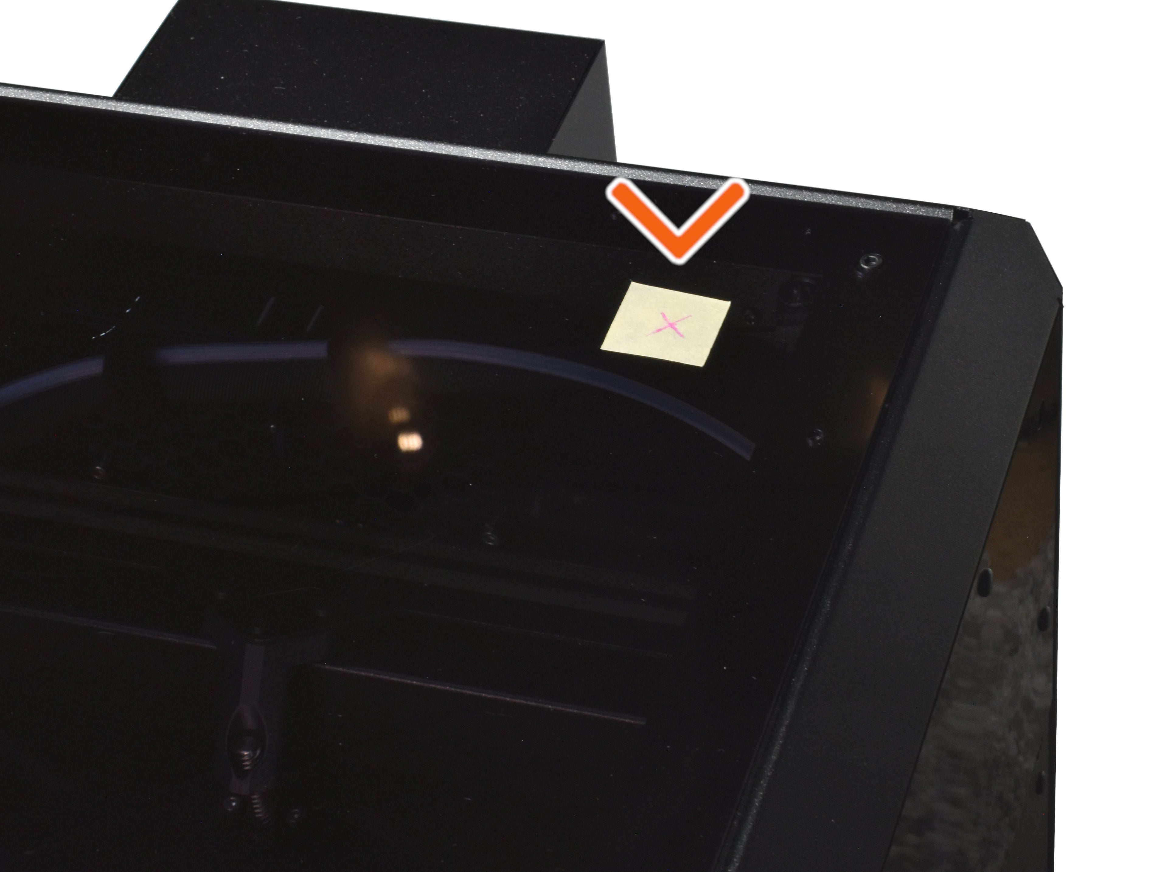 Mark the back-right corner of the CORE One's Top-panel with a piece of tape. This is where you will drill later.