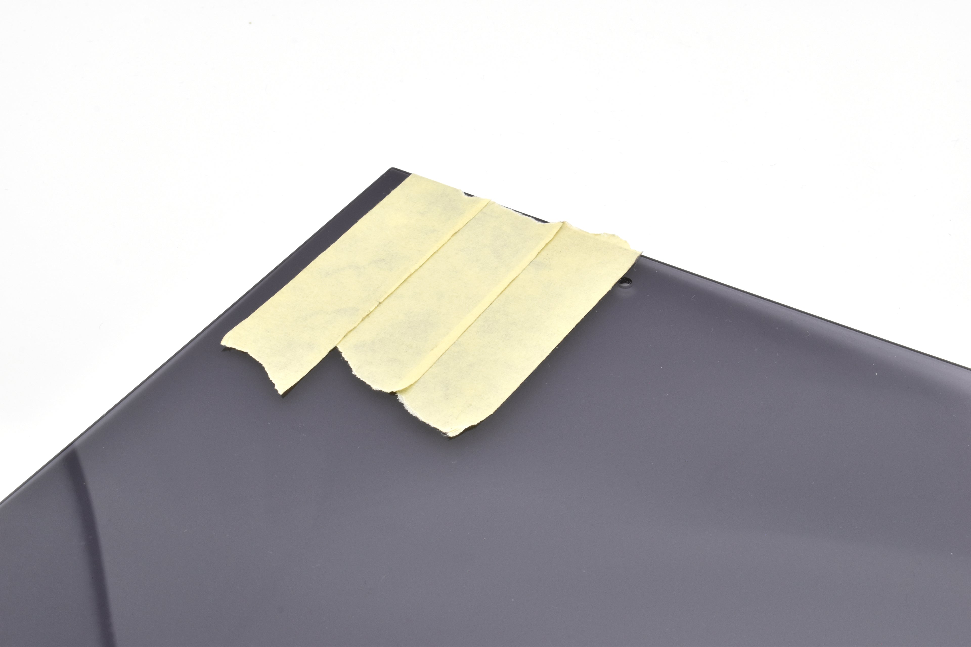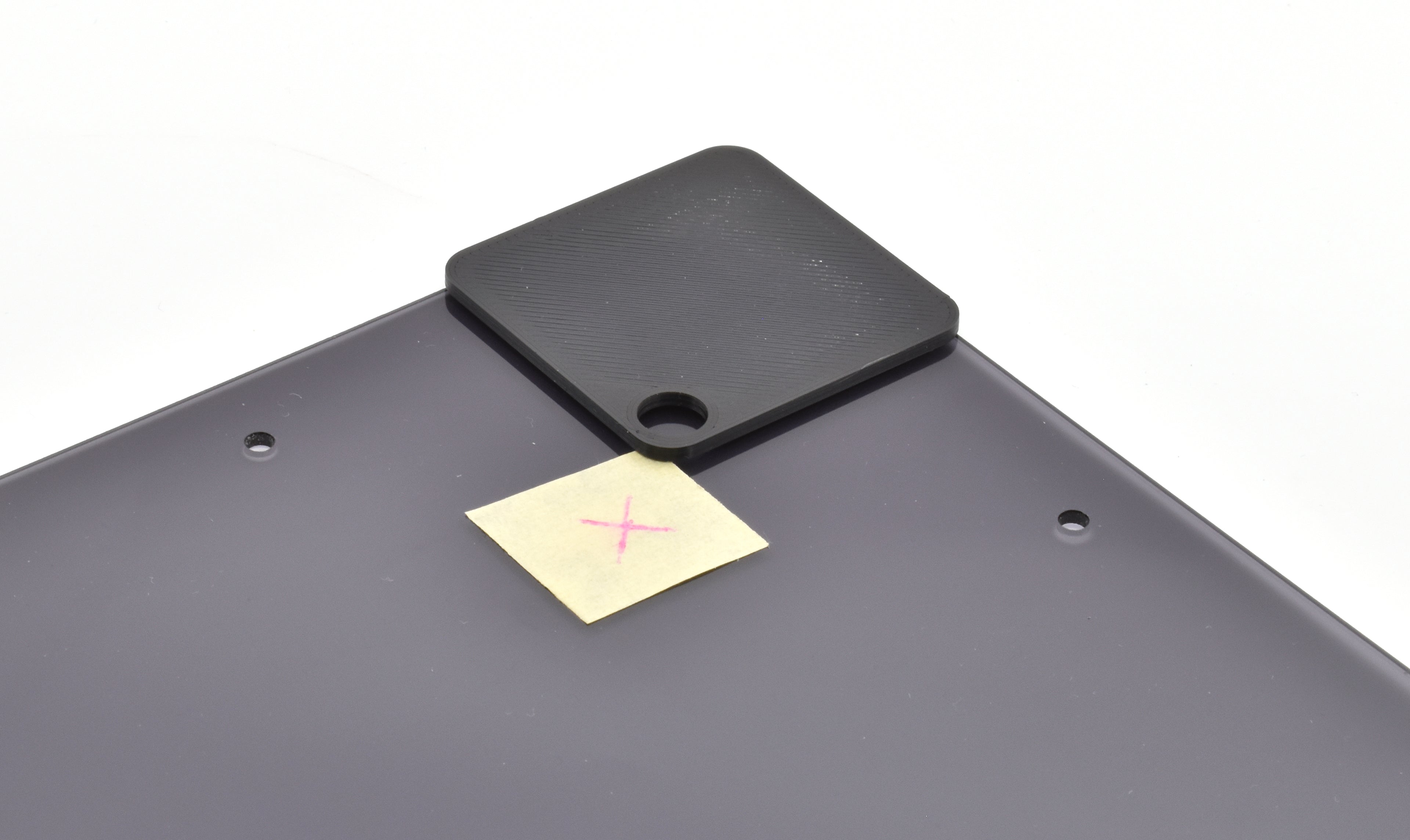 Start by attaching tape underneath the marked spot of the Top-panel This will create a cleaner hole when drilling.