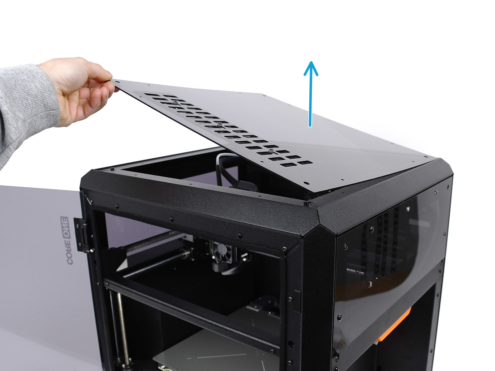 Let's first remove the CORE One's top-panel before drilling. Keep the nylon-rivets for later.